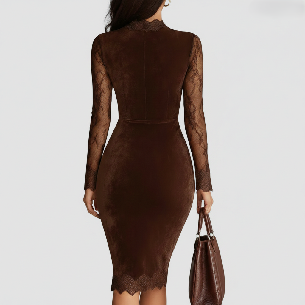 Šaty Aurora | Elegantní Sametové Šaty jsou navrženy pro elegantní okamžiky, kdy se chcete cítit sebevědomě, rafinovaně a bez námahy stylově. Vyrobeny z měkkého sametu, tyto šaty vyzařují luxusní pocit, zatímco bohatý hnědý tón zvyšuje jejich nadčasovou přitažlivost. Upravená silhouette jemně sleduje tělo, zvýrazňuje vaše přirozené proporce, aniž by se cítila omezující. Subtilní výstřih ve tvaru oka přitahuje pozornost nenápadným způsobem, přidávající nádech sofistikovanosti. Jemné krajkové rukávy přinášejí lehkost a romantiku, dokonale vyvažující bohatou texturu sametu.