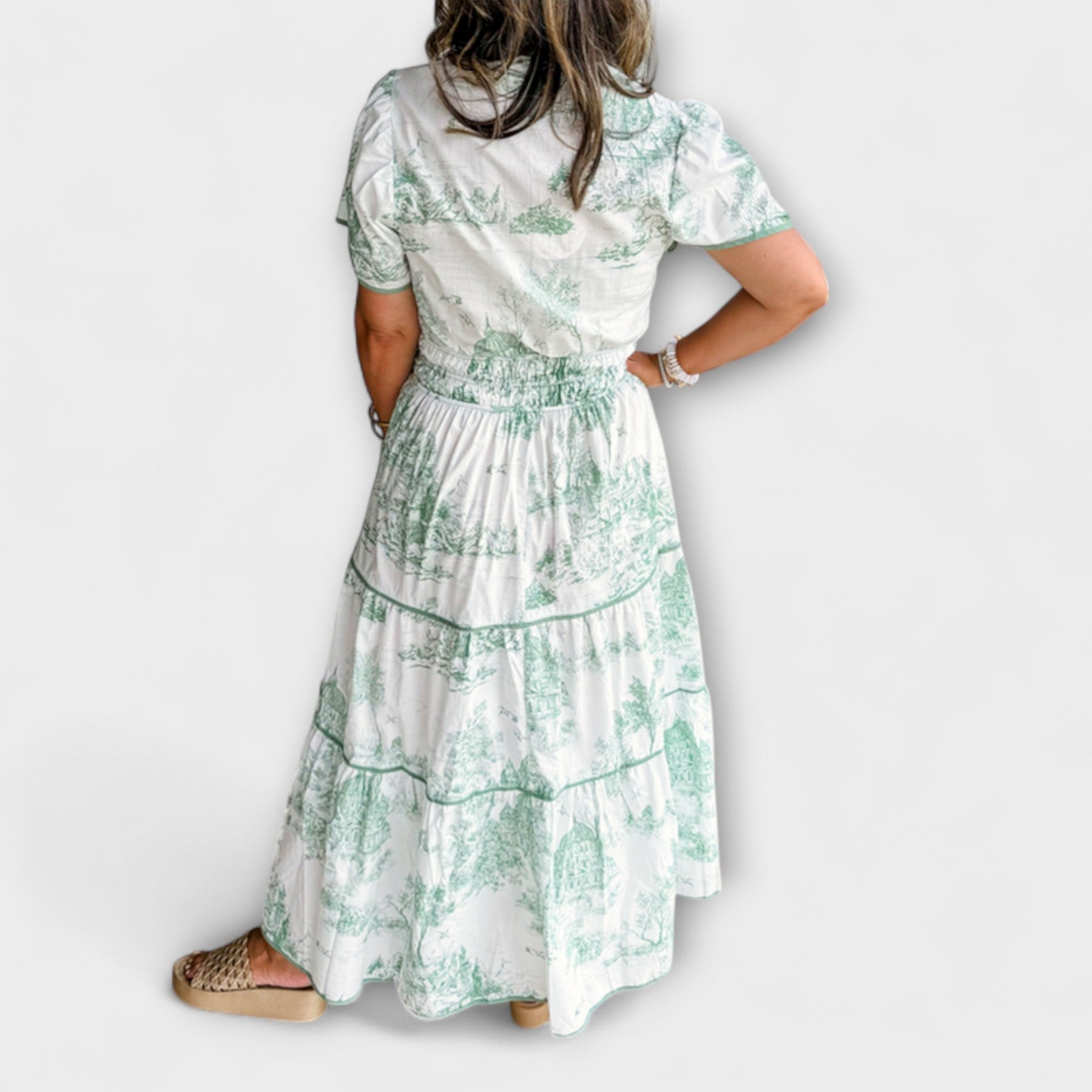 Představujeme Elizu | Klasické maxi šaty s potiskem – Váš dokonalý společník na jarní dny a zahradní párty! Tento nadčasový kousek kombinuje bez námahy elegantní vzhled s maximálním pohodlím a má ohromující zelený a bílý potisk, který vyzařuje klasický romantismus.